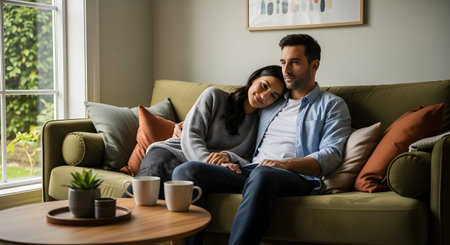 A loving couple sits closely on a green sofa, enjoying a quiet moment with warm mugs of coffee. They look content and relaxed in their cozy living room filled with natural light.