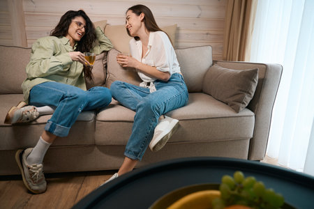 Two cheerful woman friend sitting on a sofa and talking with each other.