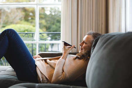 Happy senior caucasian woman in living room sitting on sofa, talking on smartphone. retirement lifestyle, spending time alone at home with technology.