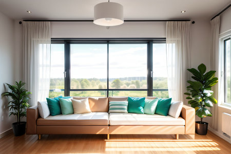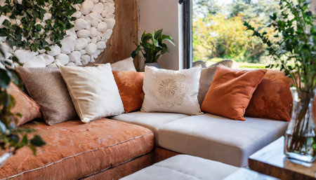 Living room sofa with cushions, plants, and apartment view, creating a modern, inviting home interior