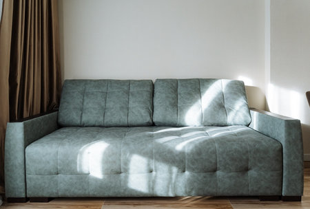 sunlit teal sofa with soft shadows and warm hardwood floor. modern livingroom staging for real estate listing, tufted fabric upholstery, plush cushions, neutral curtain, subtle texture, gentle