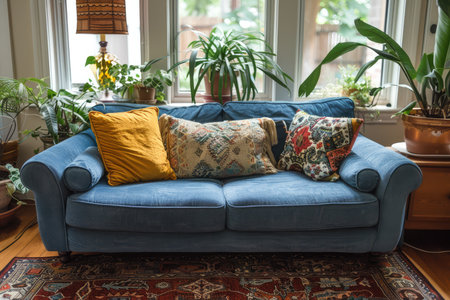 A blue velvet sofa with patterned pillows sits in a sunlit living room, surrounded by plants and a patterned rug.
