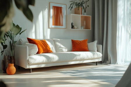 A modern living room with a white sofa, grey curtains, and orange pillows. The sun shines through the window onto the floor, creating long shadows. There are also some plants in vases around the room. On one wall, there's an art frame hanging, and there are other shelves behind the couch. --ar 3:2 --v 6.1 Job ID: fee06e76-8ef3-4ffe-bc74-7b2bfffb6c77