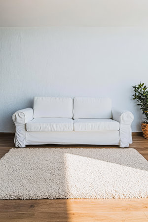 A bright and airy living room features a white sofa adorned with soft cushions complemented by a plush rug. A green plant adds a touch of nature to the minimalist decor.
