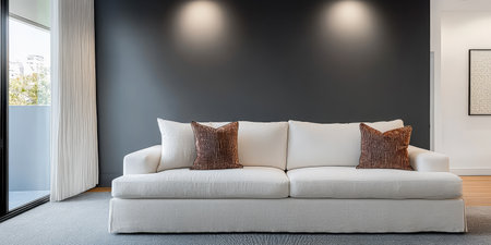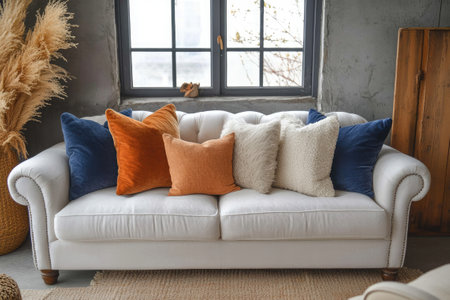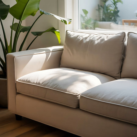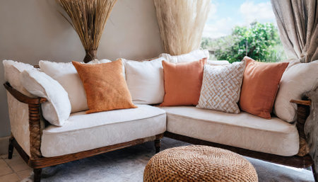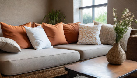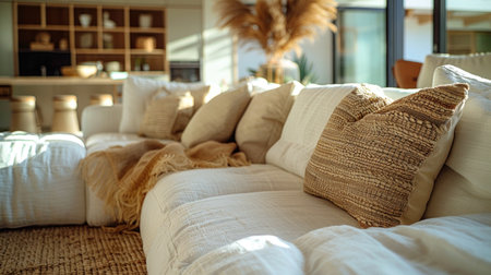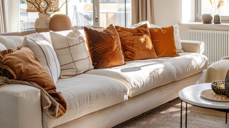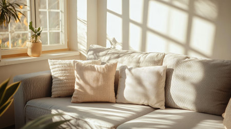 A cozy sofa adorned with soft cushions is bathed in gentle sunlight, creating a warm and inviting atmosphere perfect for relaxation in modern interiors.