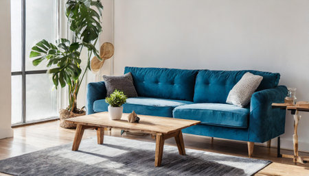 Home interior mock-up with blue sofa, wooden table and decor in blue living room,