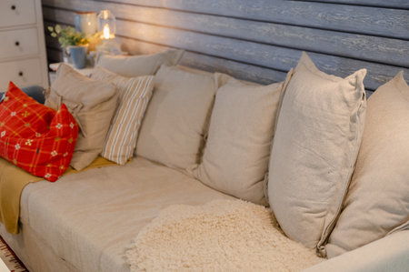 fabric sofa with pillows and lanterns in Interior of modern guestroom in studio apartments