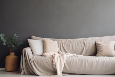 Living room interior with sofa, pillows and house plant. Place for relax at home. Cozy modern apartment. Created with Generative AI