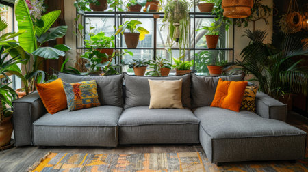 a snug seating nook featuring a grey sectional adorned with vibrant patterned cushions, complemented by lush greenery cozy living space interior design concept