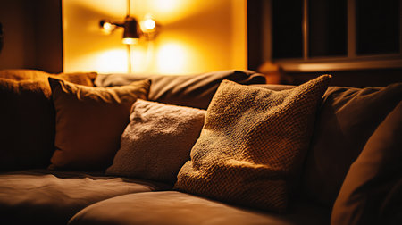 This image features a cozy living room scene with soft pillows on a neutral couch illuminated by warm lighting, creating a perfect atmosphere for evening relaxation.