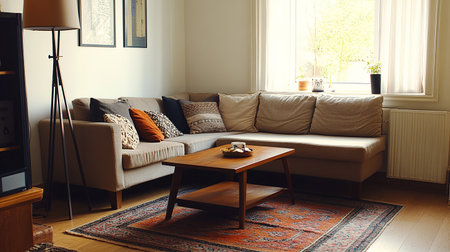 Cozy sunlit living room with soft cushions and wooden coffee table. That the image is generated using AI.