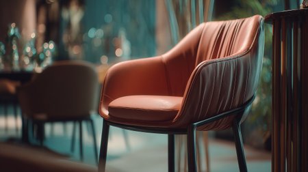 Elegant terracotta leather chair in a blurred dining room interior setting.