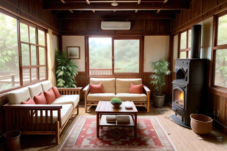 The interior of the room is in the style of ethno. A room lit by light from a window. AI generated.