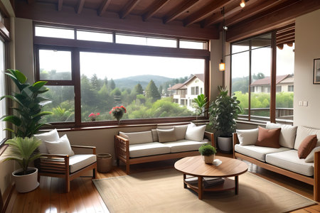 A cozy living room with modern decor, featuring large windows showcasing autumn foliage, stylish furniture, and decorative plants