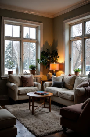 Warm light illuminating a cozy living room with sofas and armchairs, while snow gently falling outside the large windows blankets the landscape in white