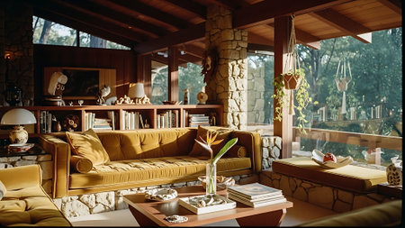 A cozy mid-century modern living room with a stone fireplace, large windows showing a snowy landscape, and stylish furniture including a patterned sofa and coffee table