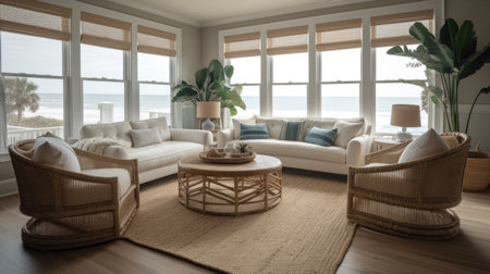 Interior design of Living Room in Coastal style with Large windows with ocean view decorated with Woven rattan chairs, jute rug material. Coastal architecture. Generative AI AIG24.