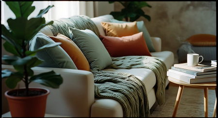 A modern living room featuring a white sofa with colorful pillows, a knitted throw, and indoor plants. A side table holds books and a cup of coffee.