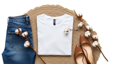 A neatly folded white t-shirt is placed next to a pair of blue jeans and brown shoes. Cotton branches are arranged around them on a jute mat, creating a rustic and casual aesthetic.