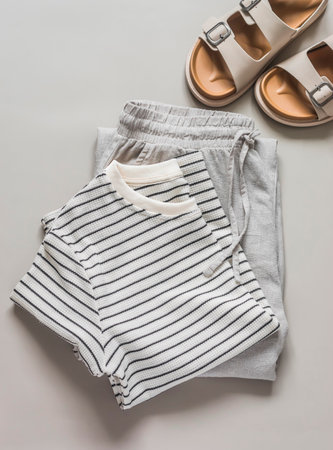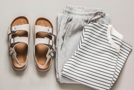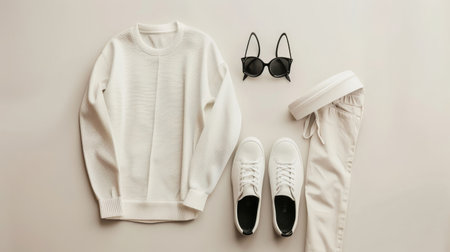 A monochrome outfit laid out against a neutral background, the simplicity of the color palette and arrangement underscoring the minimalist aesthetic.