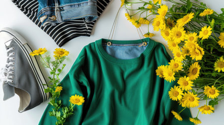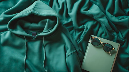 Top View Green Sweater and Hoodie Mock-up Unisex Fashion, Book, Sunglasses