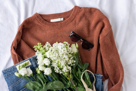 Clothing women flat lay with blue jeans, brown sweater, sunglasses and big bouquet of flowers on white, Eco fashion blogger content, autumn and spring outfit flatlay, minimalistic look of the day, lisantius and white lilac blossom close up