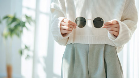 Person holding sunglasses with both hands against their white shirt