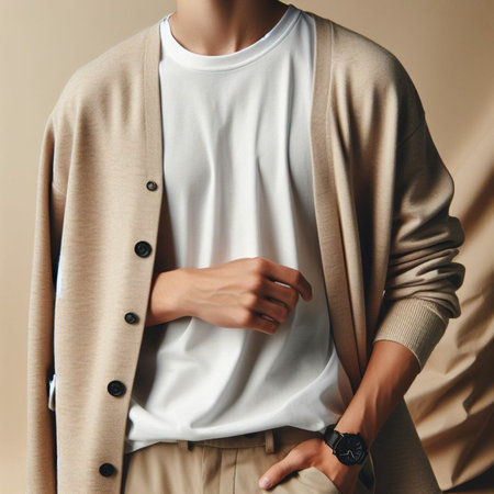 Fashion photo of a young man in a beige sweater and white shirt