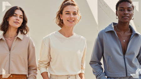 woman and girl in suede jackets and trendy pants looking at camera while posing on beige background, banner