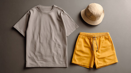 minimalist summer outfit flat lay, gray tee and yellow shorts paired with bucket hat, neatly arranged, cozy warm light, simple studio setup, balanced layout
