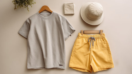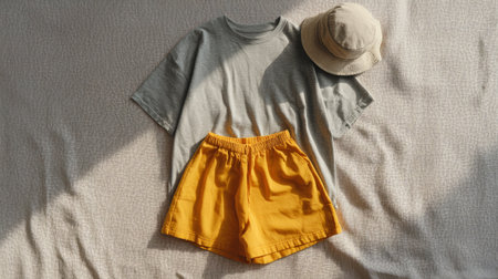 pastel flat lay outfit, gray tee and yellow shorts with matching bucket hat, gentle warm lighting, minimalist composition, modern lifestyle concept