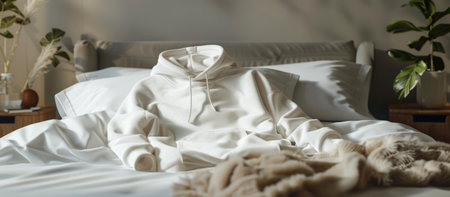 A cozy, oversized hoodie mockup placed on a soft bed with warm blankets, creating a relaxed and inviting atmosphere, --ar 16:7 --v 6 Job ID: ea13e2f3-8d52-4f30-902f-f9175abe6a29