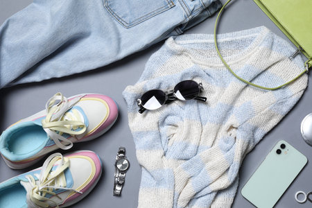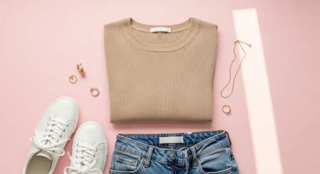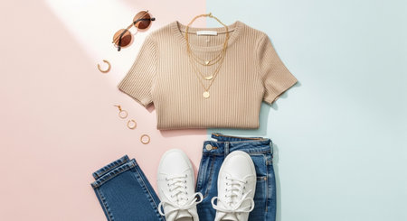 Flat lay of woman's clothes and accessories on pastel background