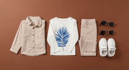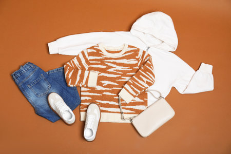 Flat lay composition with stylish child clothes and shoes on brown background