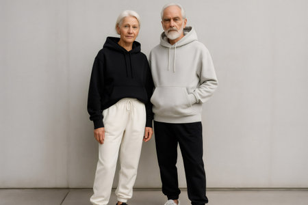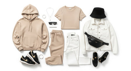 A top-down view of a contemporary casual outfit with a hoodie, jeans, and sneakers arranged perfectly for a relaxed look.