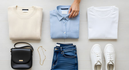A neat flat lay arrangement of a minimalist capsule wardrobe on a white wooden background. The set includes a blue shirt, beige sweater, white t-shirt, jeans, white sneakers, and a black handbag, representing organized fashion.