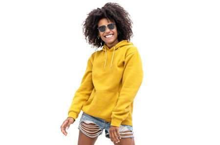 Happy smiling girl with afro hairstyle posing on the white wall, wearing yellow blouse and fashionable sunglasses. A lot of copy space.