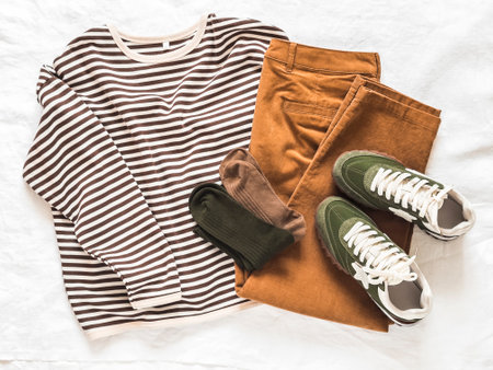 Flat Lay with women casual outfit on white bed sheet, top view,