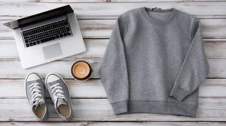A flat lay arrangement featuring a cozy gray sweatshirt, casual sneakers, and a laptop on a rustic wooden table, complemented by a cup of coffee.