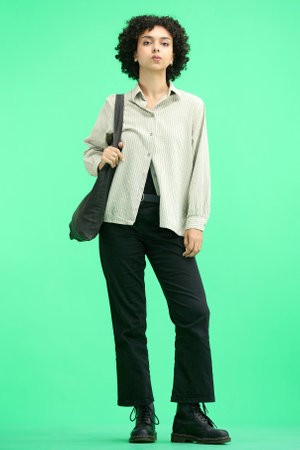 Portrait of a beautiful young woman with dreadlocks in a green hoodie and hat on a green background