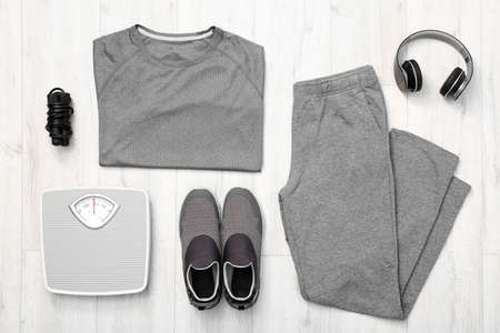 Composition with sportswear and weight scales on wooden background