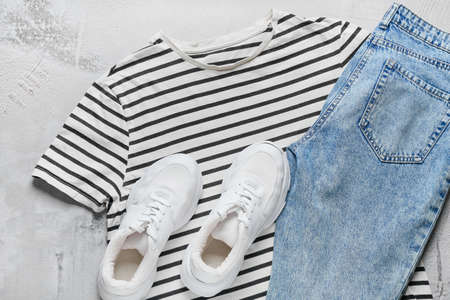 Stylish t-shirt, jeans and shoes on light background