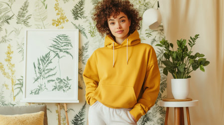 A young woman with curly auburn hair stands confidently, wearing a yellow hoodie and light pants.