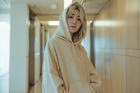 Portrait of a beautiful young woman with blond hair in a beige hoodie.