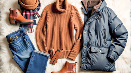 Women fashion clothes and accessories. Feminine youth collage top view. Flat lay female style look with warm sweater, jeans, glasses. Top view.