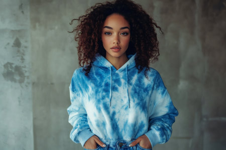 Fashionable woman wearing blue tie dye hoodie standing against a gray wall