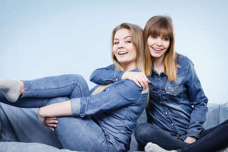 Friendship, human relations concept. Two happy women friends or sisters wearing jeans shirts sitting on sofa having fun.