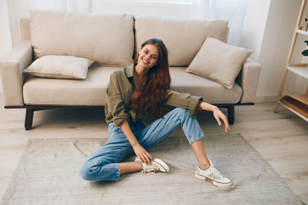 Comfortable, Cosy Home: Woman Relaxing on Modern Sofa in Peaceful Living Room