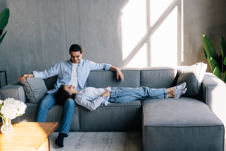 Cute couple in love in the weekend. Happy couple sitting and hugging in a comfortable couch in the living room at home. Enjoying time lifestyle concept.