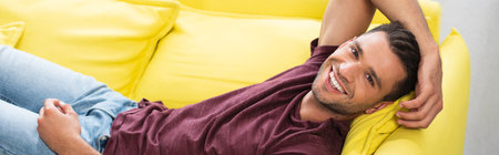 Charming young woman relaxing on a sofa while wearing a colorful sweater in a cozy home interior during leisure time